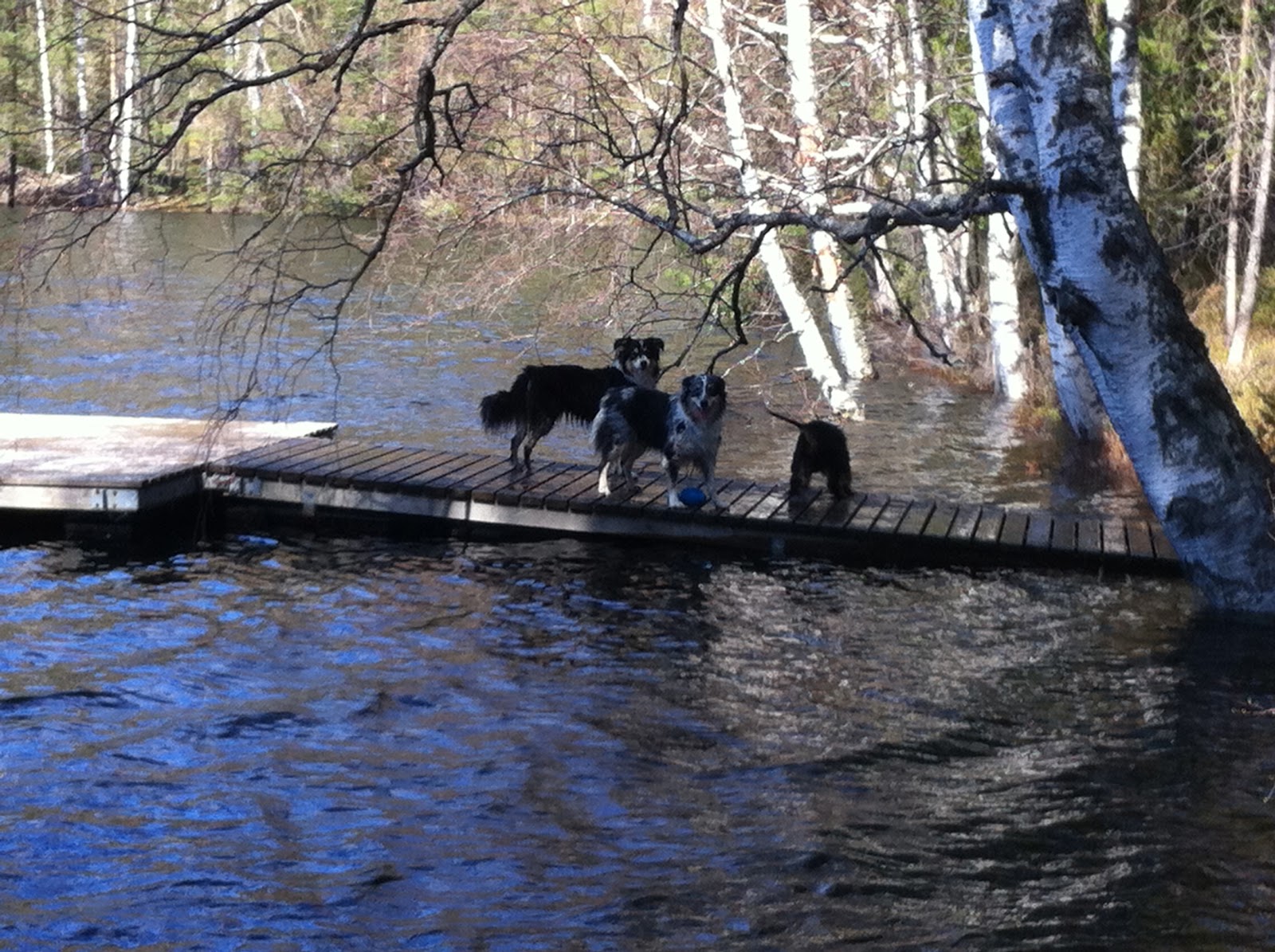 Tie helvettiin on kivetty hyvillä aikomuksilla ja huonoilla suunnitelmilla. Ei koirien pitänyt mennä uimaan, koska vesi oli jääkylmää. Mutta kuinkas sitten kävikään. Viiru lähti veneajelulle Lean kanssa kaksistaan. Siinä se napotti veneen kokassa liikkumatta ja odotti... En voinut vastustaa kiusausta kutsua se luo. Hieman empi, heitin lelun veteen. Teimme vielä toisen, ja Viiru loiskautti veteen reippaasti. Topi teki samanlaisen veneestä hypyn, tosin houkuttelematta. Toisena liikkeenä Topi teki kerran aiemmin kokeillun avoimen luokan oman veneen hinauksen. Se käy jotenkin ihan luonnostaan, vaikkei voi edes käskyjä antaa.