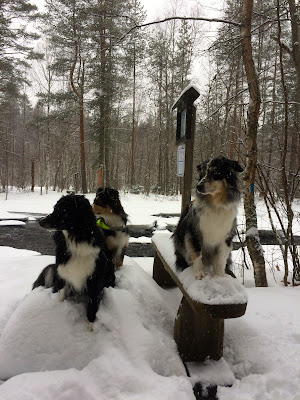 Agilityssa teimme historiaa: Pikin kanssa kokonaisen radan (yksi kielto putkelta, kun en ohjannut loppuun asti). Elisa oli tuonut treeneihin kepittömän möllihypärin. Kiva kokea hieman edistymisen tunnetta. Estehakuisuutta Piki tarvitsee vieläkin lisää - tai niin, että estehakuisuutta on aina eikä Piki masennu tai jää kiinni minuun, jos tulee jokin vastoinkäyminen. Vaikeinta oli rytmittää oma liike hypylle 6 niin, ettei Piki singonnut ulkoavaruuteen kaarteesta.